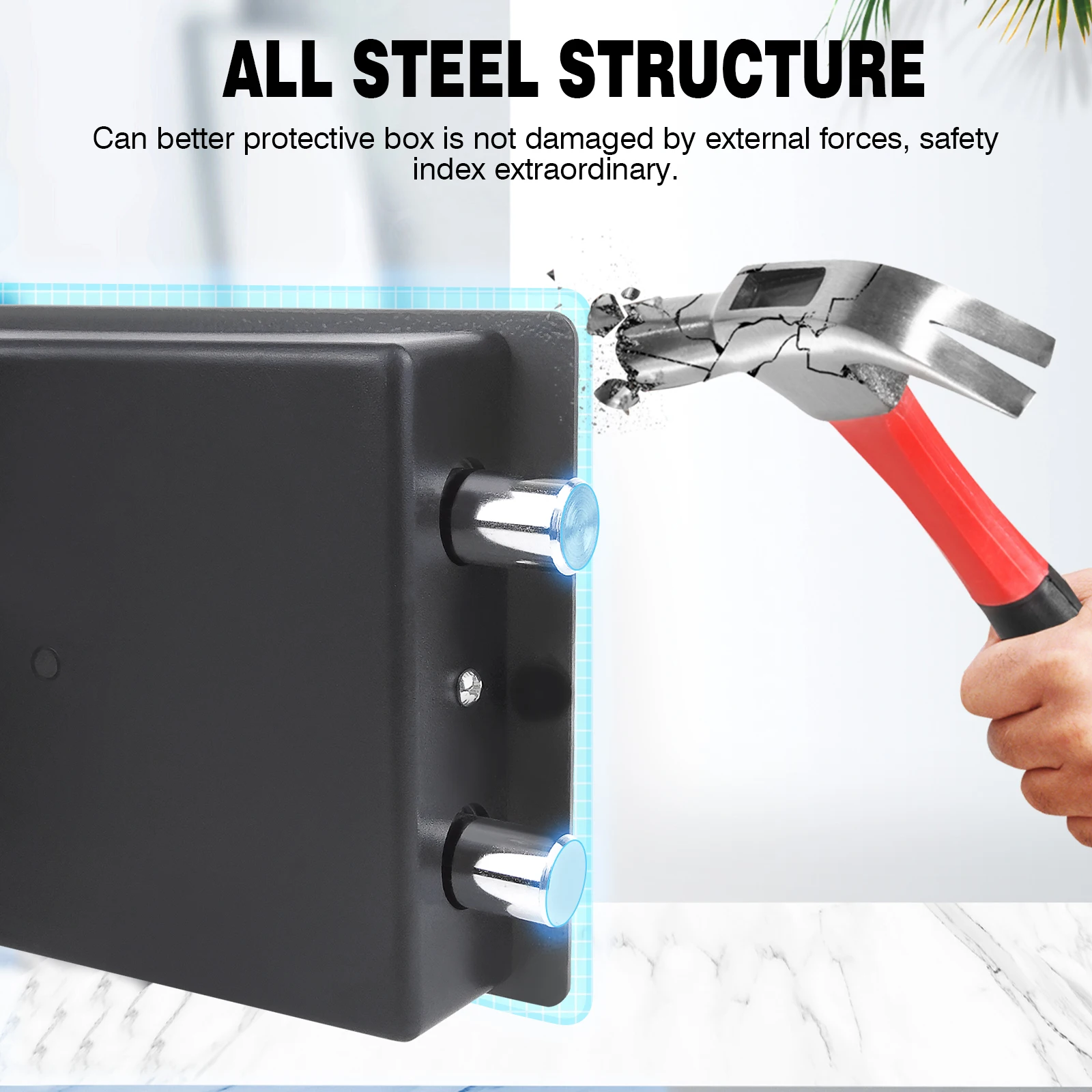 2. Combination Lock: The electric safe box comes with PIN code and 2 emergency keys. You can open the steel safe by either entering the 3 to 8-digit PIN code or simply using the keys. Even if you forget your code or the batteries are empty, you can still open the safety safe. (Please keep the keys safe cause they are one-to-one. Please DO NOT lock the keys inside the safe without setting the code.)