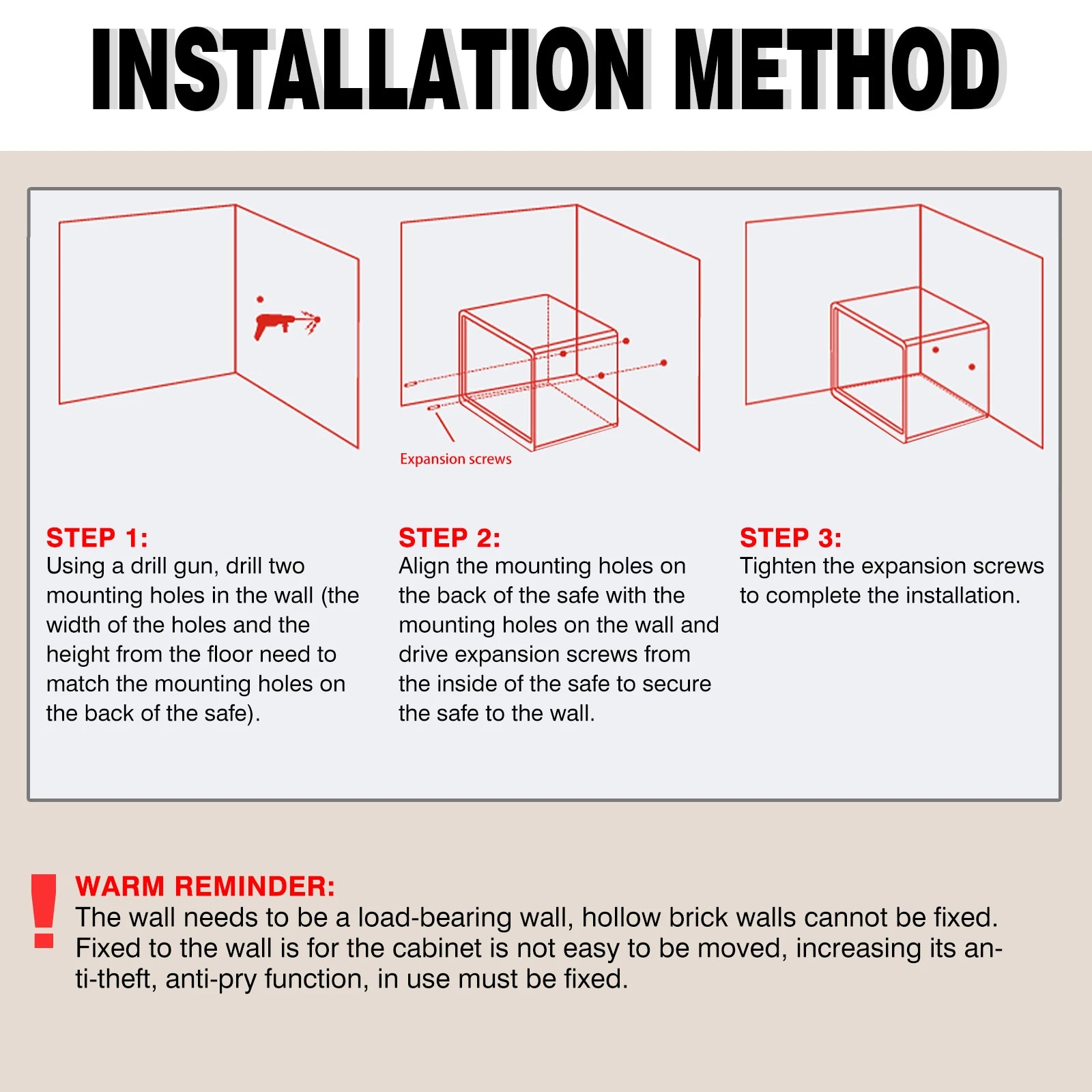 3. Wall or Floor Mounted: Pre-drilled holes behind the cabinet safe with included 125px bolts for anchoring ,wall or cabinet