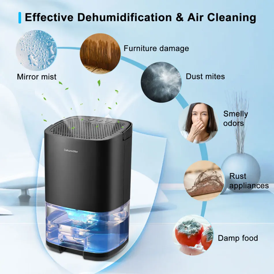 Efficient Powerful Dehumidification: Featuring Peltier technology (no compressor required), our small dehumidifier has a water tank capacity of up to 1000ml. It can remove up to 450 ml of water per day at 30°C and 80% RH. Dehumidifier for drying clothes, ideal for bedrooms, offices, bathrooms, caravans.