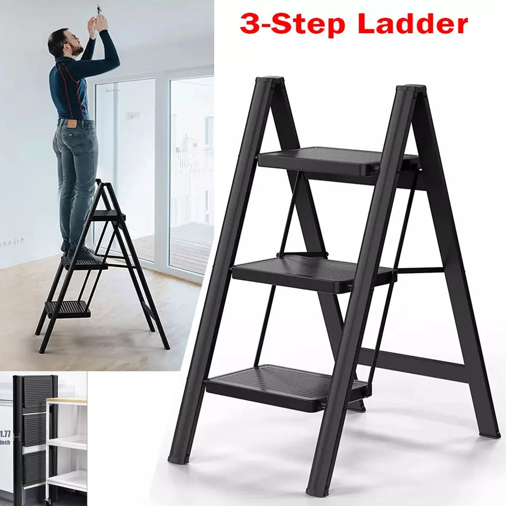Lightweight and Easy to Carry: Lock and open system of the small ladder for easily opening and folding. The lightweight closet step stool . It folded for storage and transportation. The step stool ladder is easy to carry for use indoors, outdoor, kitchen, pantry, bathroom, office, garage, books pavilion, or anywhere else in your home.