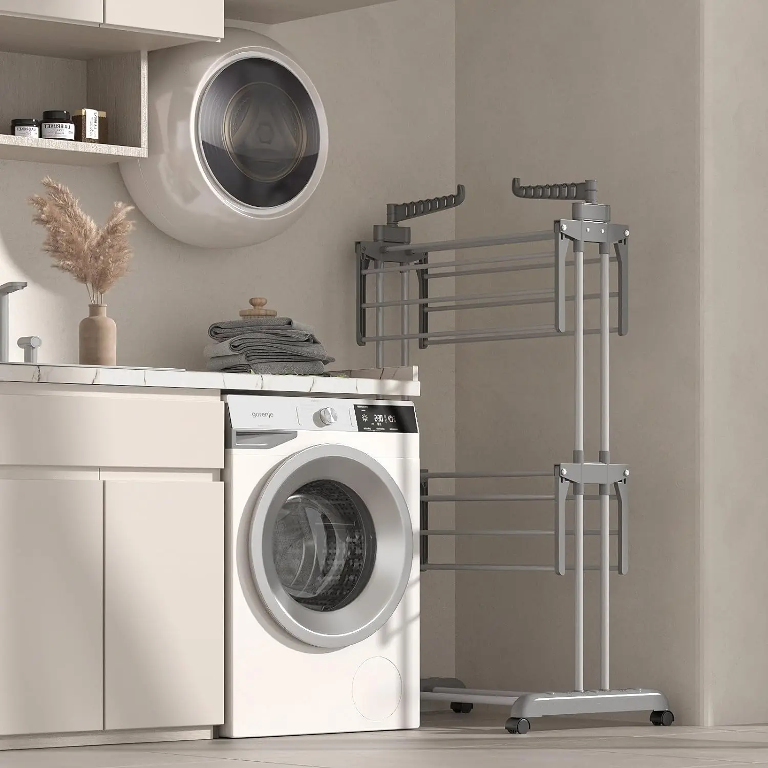 3,Mobile and Secure: Equipped with four casters for easy mobility, the drying rack also has two lockable diagonal casters to keep it securely in place when needed.