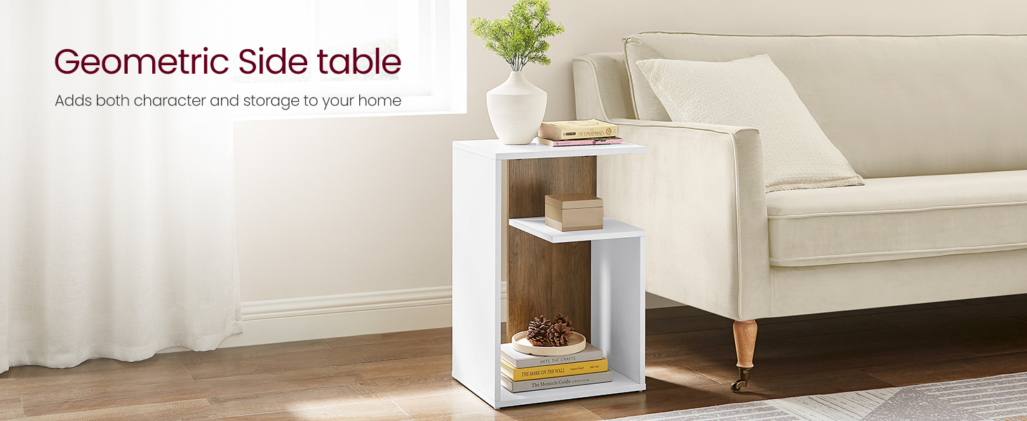 [Modern Minimalist] A blend of rustic walnut with white colour, unique open design, and sleek lines impart simplicity and elegance to this chic side table, making it easy to go with various home decor styles