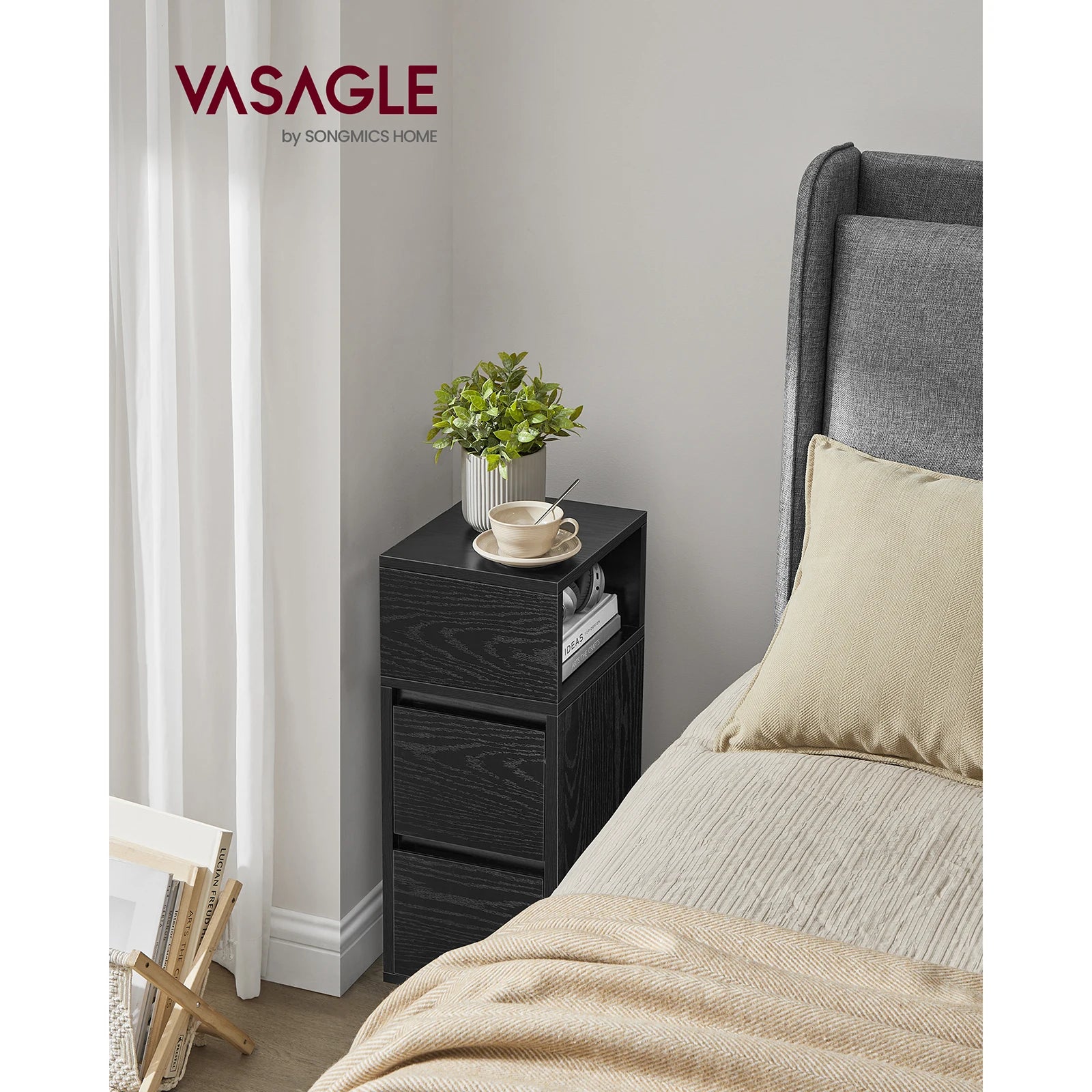 VASAGLE Slim Bedside Table, Small Narrow Side End Table with 2 Drawers, 1 Open Compartment Mounted to Face Left or Right
