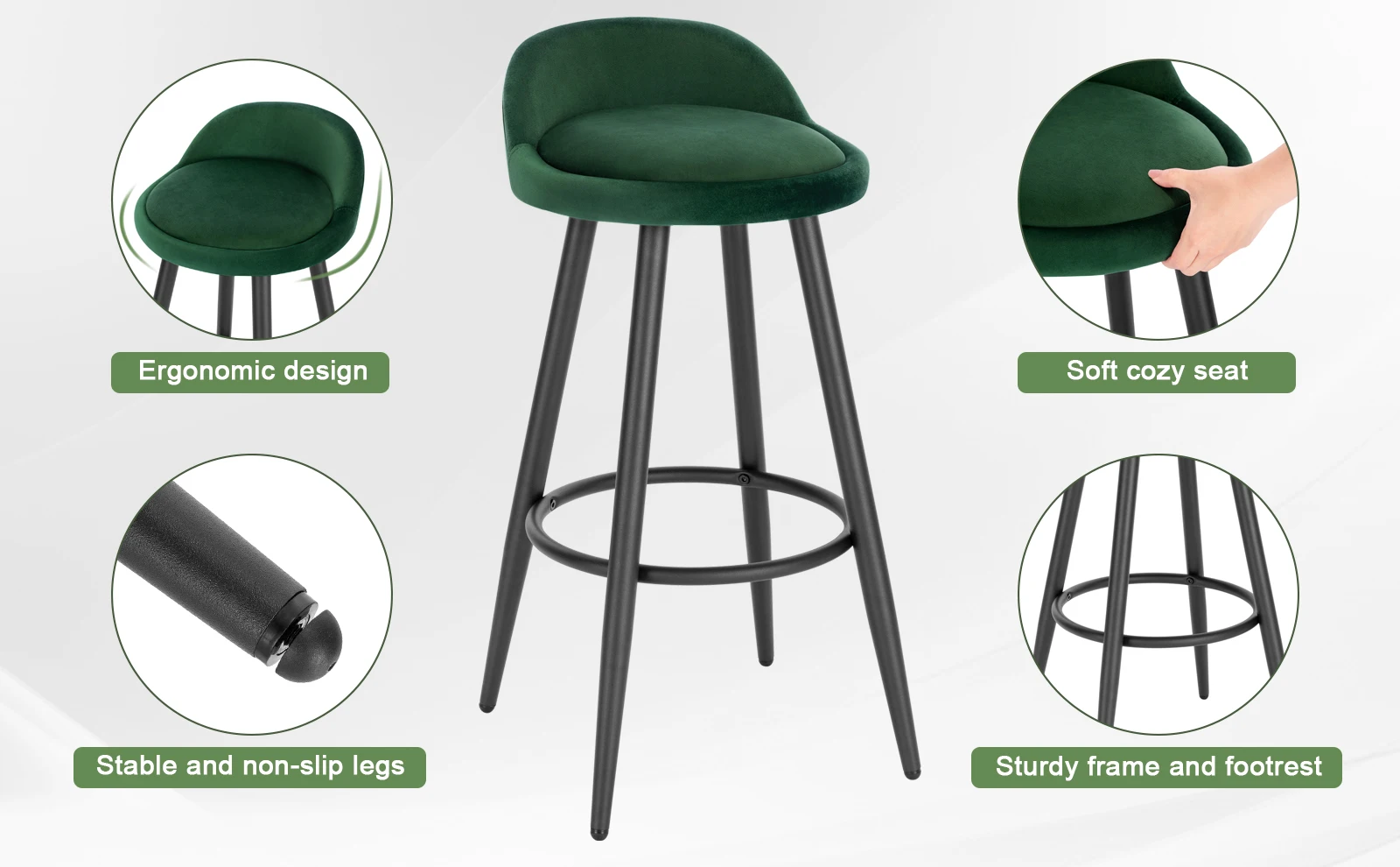 HIGH COMFORT - The seat of the bar stool is fully padded with new cotton and covered with a soft velvet cover. The materials are breathable and ensure a high level of comfort. The small backrest of the counter stool is particularly comfortable and gives your tailbone extra support in the background. The footrest is ideally adapted to the average seat area and contributes to a comfortable sitting position.